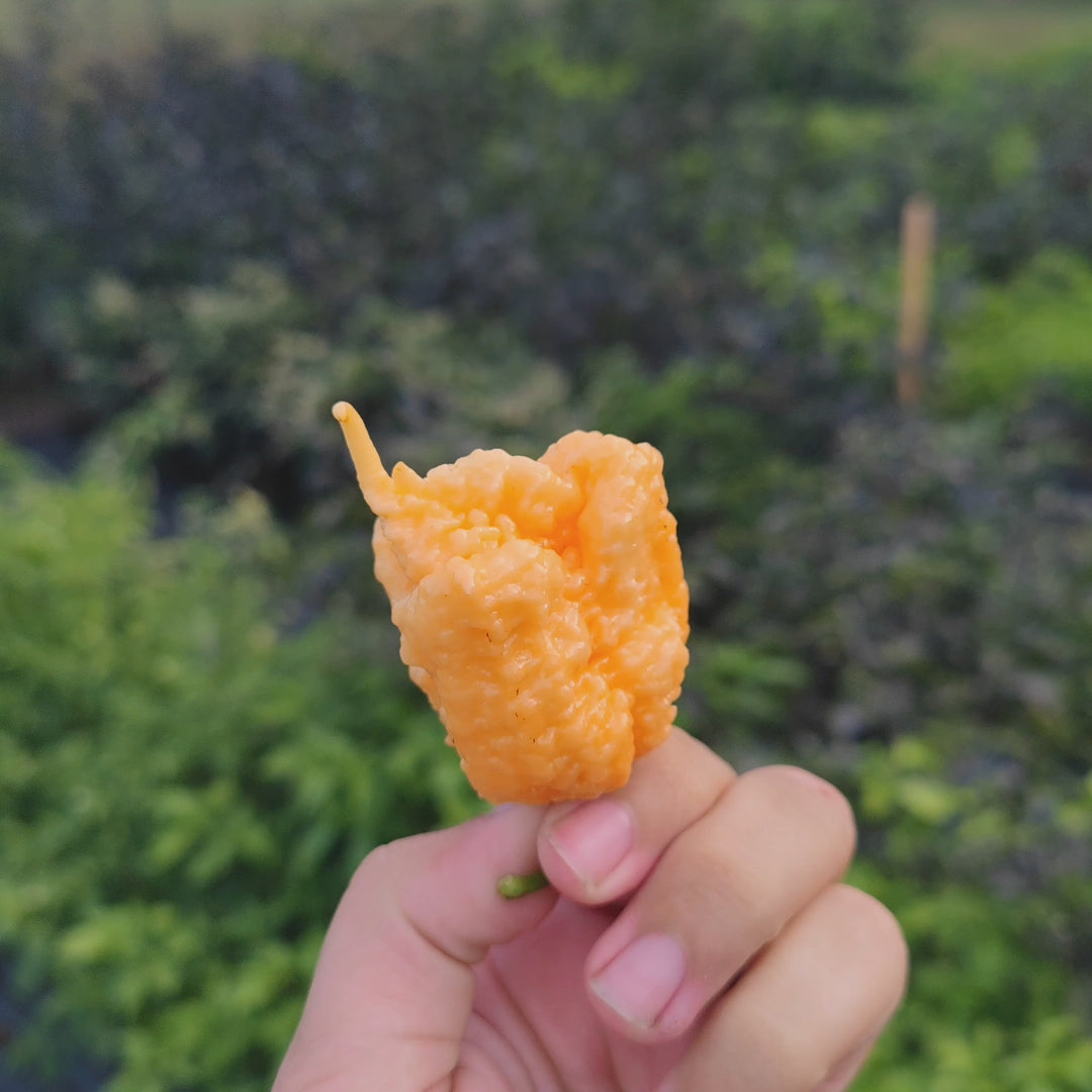 Peach Miasma est sans doute l'un de mes piments les plus piquants de la saison. D'après la documentation que nous avons trouvée en ligne, il s'agit peut-être d'un croisement JPGS x Reaper. Nous avons conservé de manière sélective les graines des plantes les plus intenses.