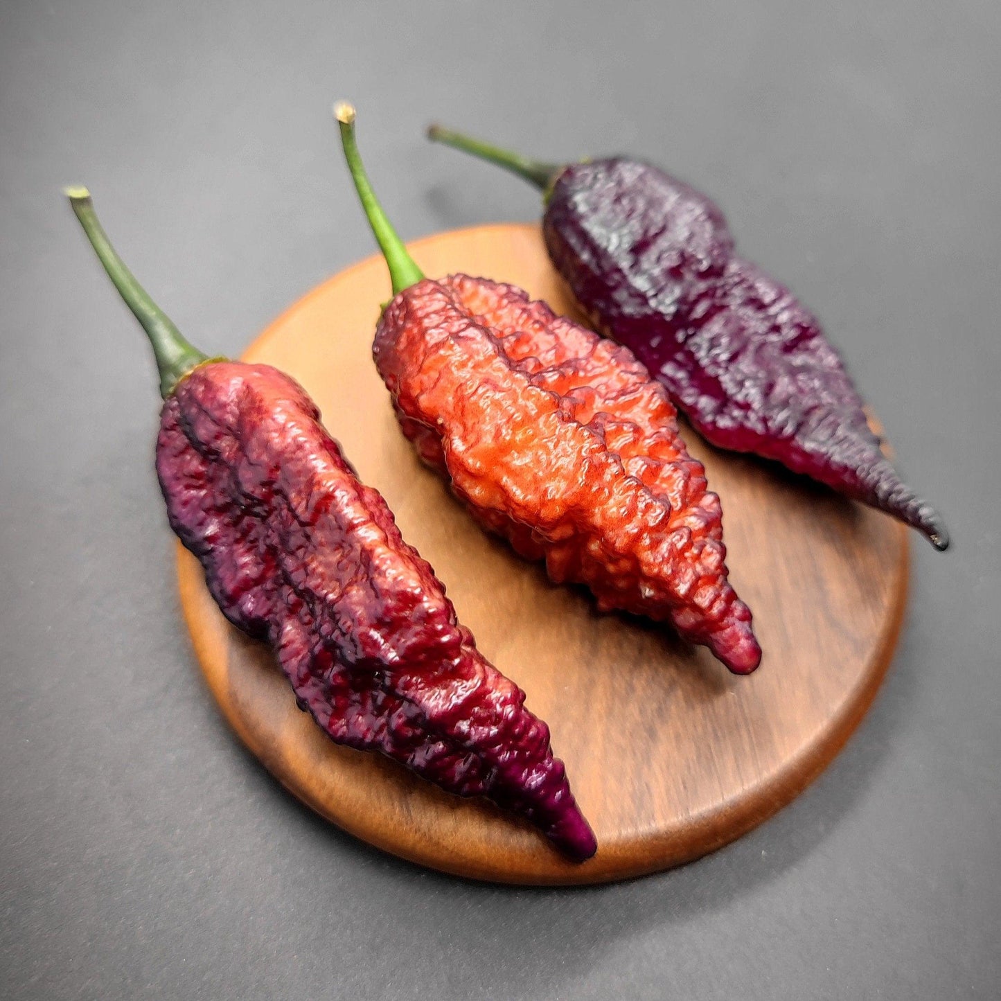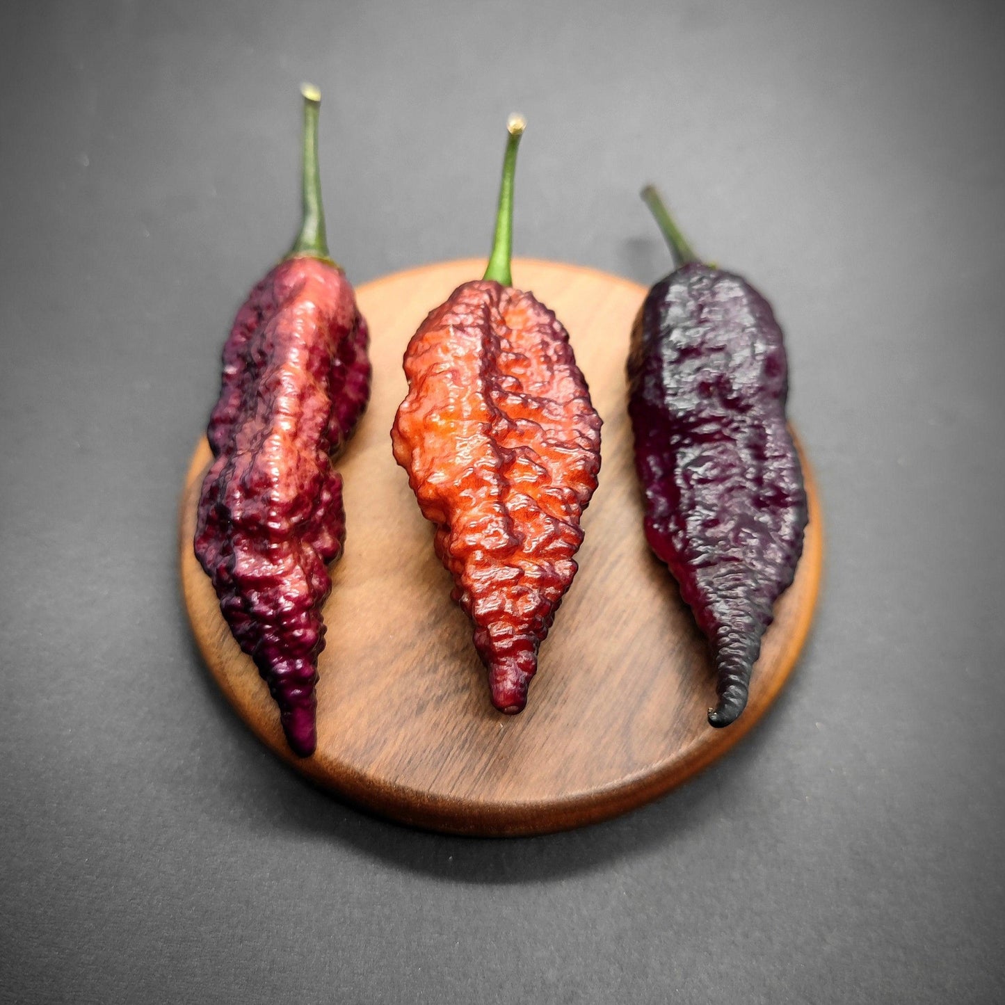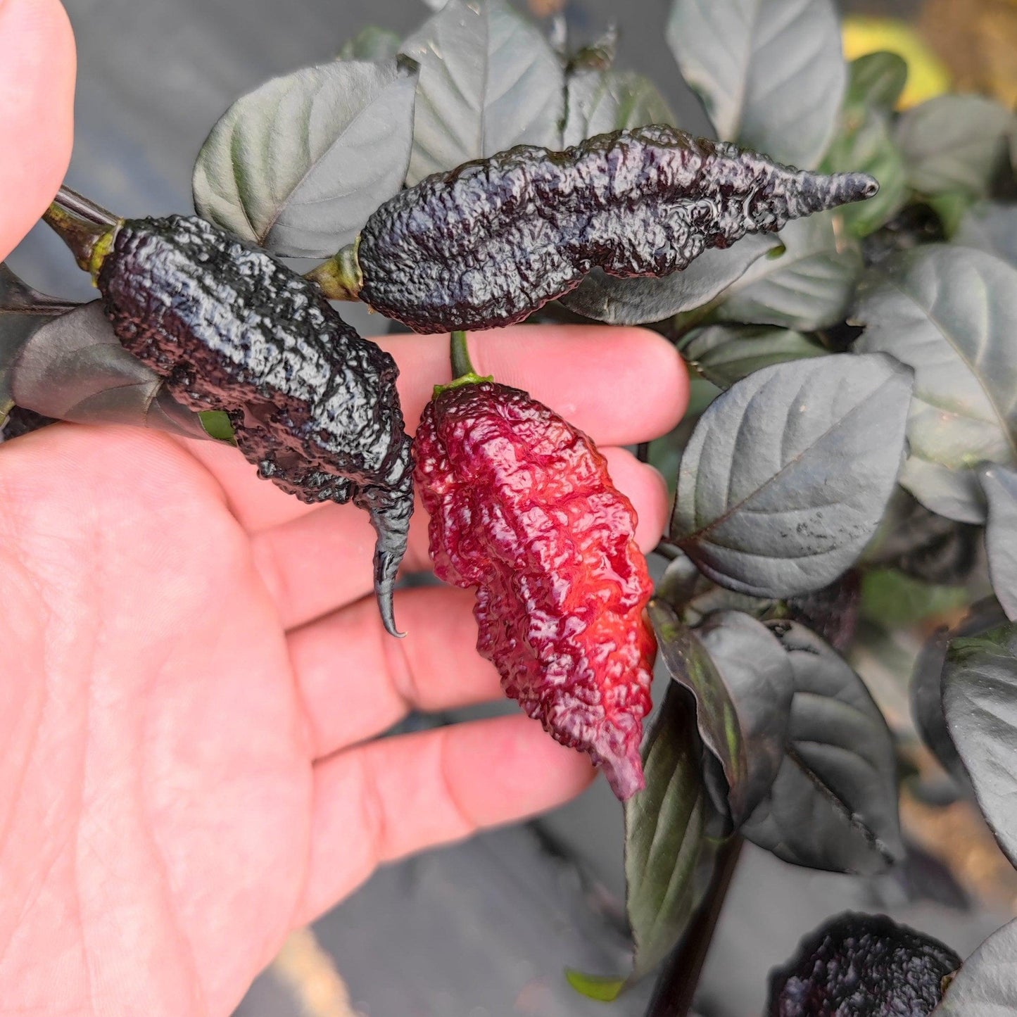 Pods start out jet black and then ripen to a reddish peachy purple.